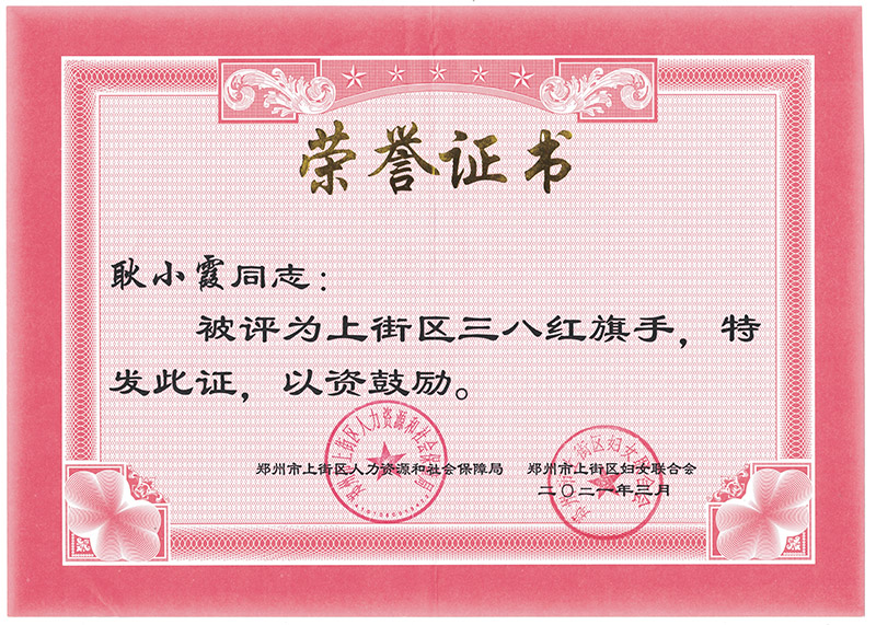 3月6日,上街区庆“三八”表彰大会暨“学党史”宣讲活动在区新时代文明实践中心举行。郑州尊龙凯时机械股份有限公司耿小霞女士荣获“三八红旗手”荣誉称号。