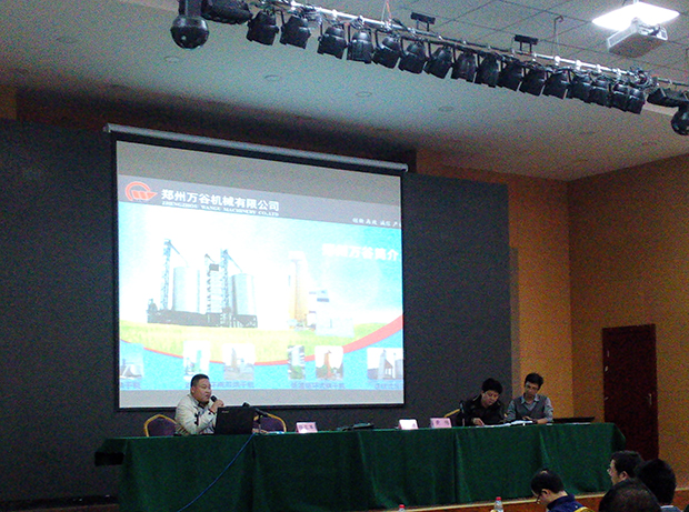 郑州尊龙凯时机械有限公司由张彦亭副总经理带领公司技术、销售专业团队携公司新产品参加本次会议。在培训会议开始前,郑州尊龙凯时携带的设备模型和企业展板刚一展示,立刻有众多的参会代表围了上来,一边观看产品宣传信息一边向公司人员咨询。针对本次培训会参会人员的实际需求,郑州尊龙凯时机械有限公司此次向参会人员推荐了四款产品:小型循环式烘干机、小型连续循环两用烘干机、连续式顺逆流烘干机和连续式混流烘干机。根据会议安排,公司粮食烘干技术负责人李志刚在培训会上向参会人员详细介绍了产品技术优势和企业实力,并根据合作社不同规模的种植面积采取何种烘干机提供了参考意见。