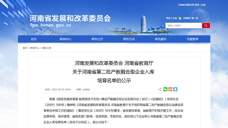 近日,河南省发展和改革委员会发文公示:经企业申报、地市推荐、省相关部门联审、实地考察、专家评估,拟将包括郑州尊龙凯时机械股份有限公司在内的108家企业纳入河南省第二批产教融合型企业入库培育名单。