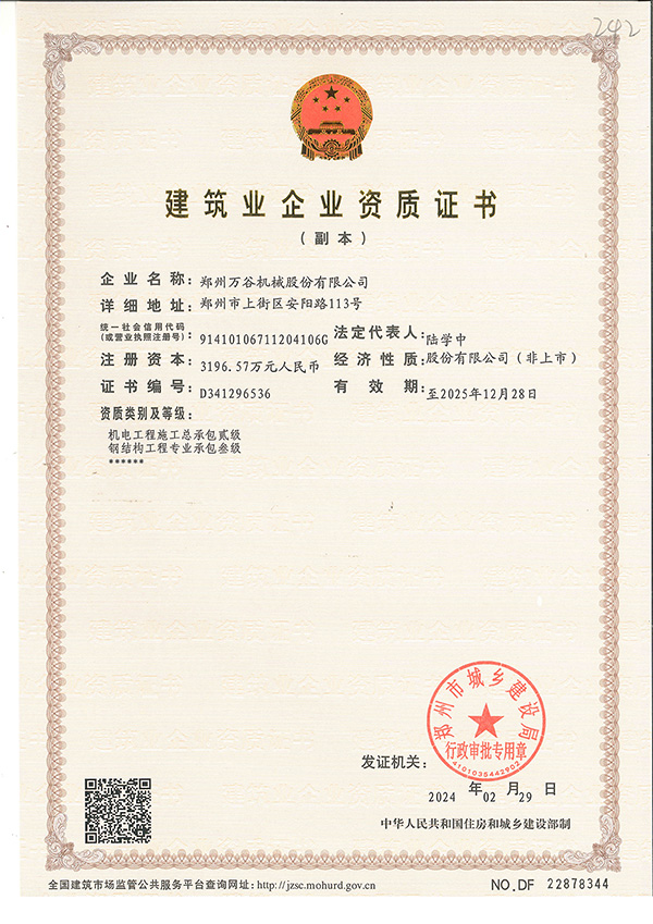 近日,郑州尊龙凯时机械股份有限公司成功获得机电工程施工总承包二级资质证书的批复。这标志着公司在机电工程施工总承包资质和能力方面将再上新台阶。该资质的取得,标志着郑州尊龙凯时今后将能在机电工程施工总承包领域承担规模更大的施工项目,也意味着公司在机电工程项目中具备更强的施工能力,将为公司业务拓展和项目承接提供更强的保障和支持。