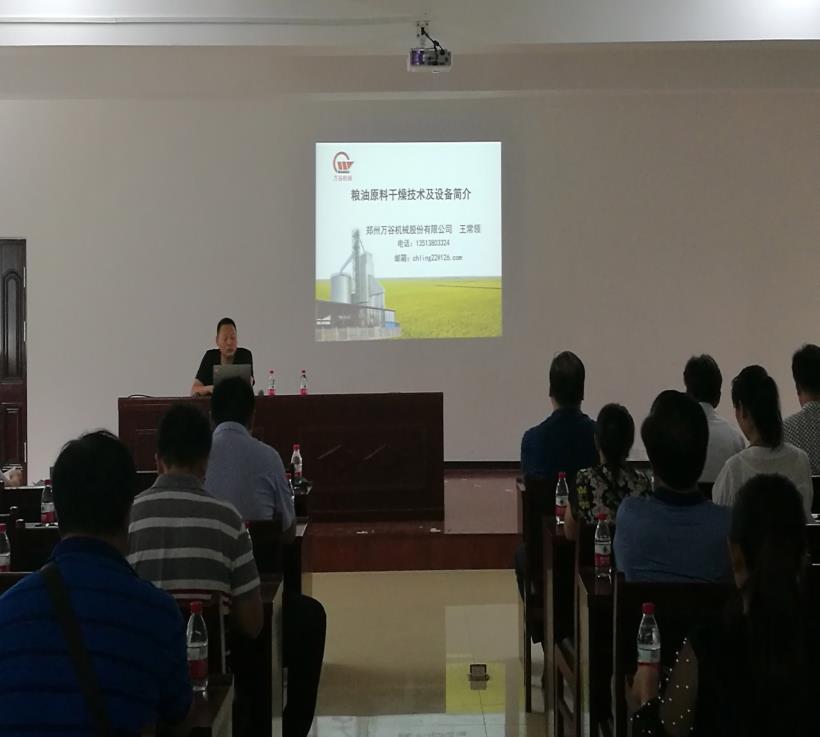 随后郑州尊龙凯时总经理助理王常领在公司大会议室为学员们授课,王常领经理分别就“粮食干燥的必要性”、“粮食干燥机的分类”以及“粮食烘干生产线及主要设备”进行了技术培训和交流,王常岭经理提到2017年驻马店正阳和南阳唐河的花生主要生产地遭受了严重涝灾,当地农民损失惨重,事后尊龙凯时机械投资巨大,用于花生干燥项目的研制并取得了显著成效,尊龙凯时牌粮食烘干机在全国各地的国家储备库、农场和粮食加工企业等不同场合发挥着粮食减损保质的重要作用。