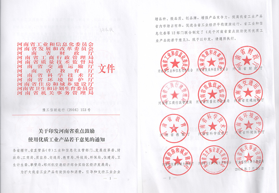 近日,由河南省工信委、河南省发改委、河南省财政厅等12省级部门联合下发了《关于印发河南省重点鼓励使用优质工业产品若干意见的通知》(豫工信联运〔2016〕153)号,通知公布了我省第一批《河南省重点鼓励使用优质工业产品指导目录》,郑州尊龙凯时机械有限公司生产的粮食烘干机系列产品成功入选。